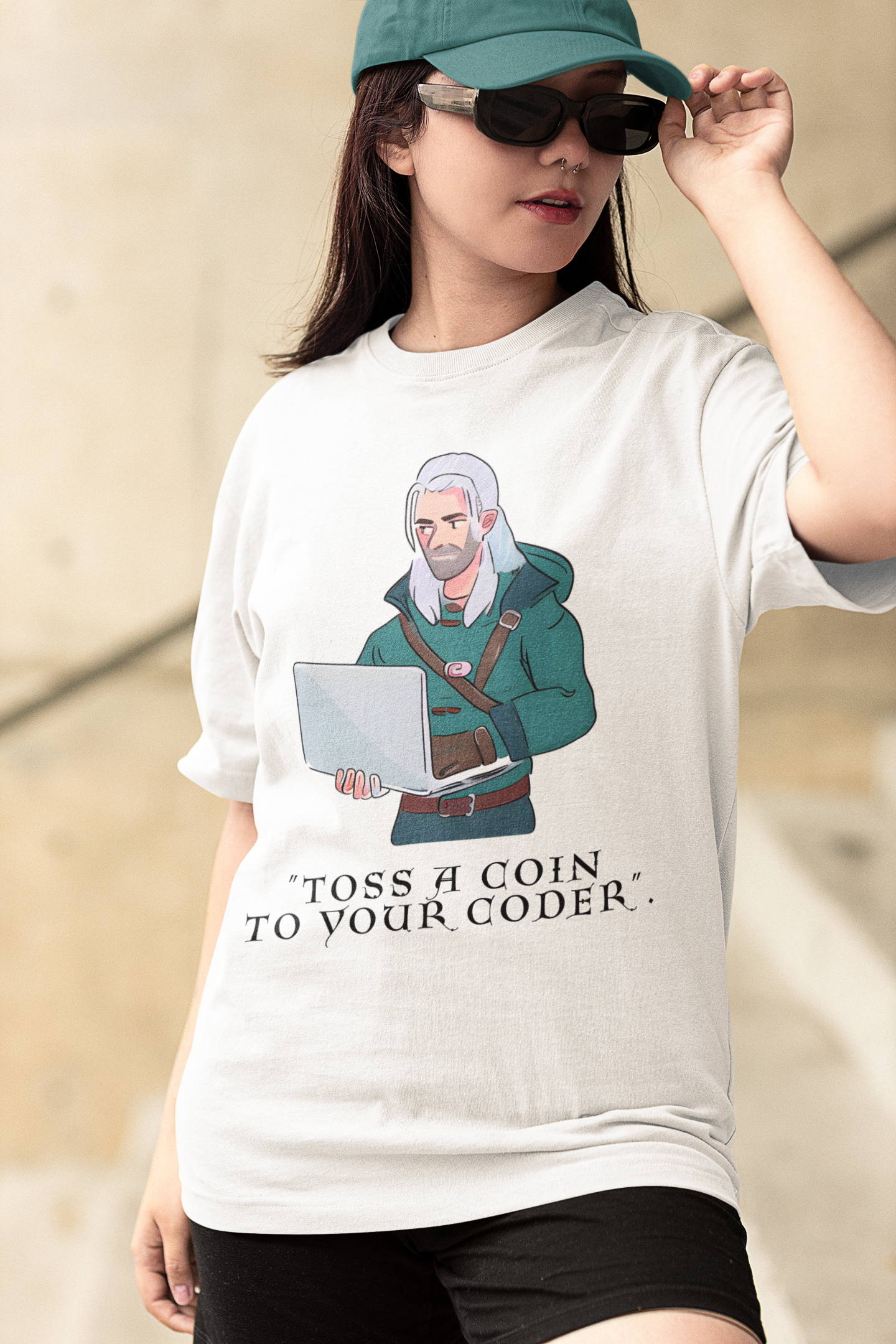 Are you a fan of slaying mythical beasts and debugging mythical code? Then this Witcher-inspired tee is a must-have. Made for both witchers and coders, "Toss a Coin to Your Coder" is a blend of geek culture and fashion.